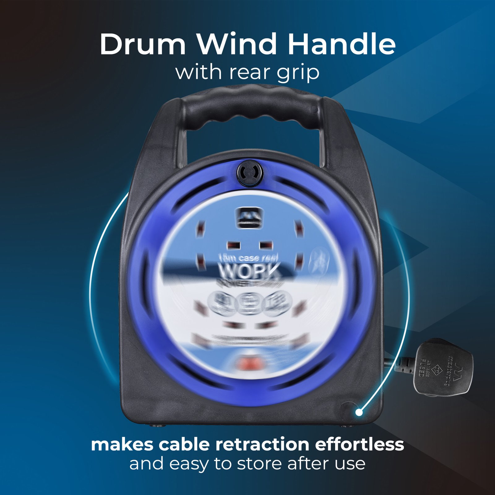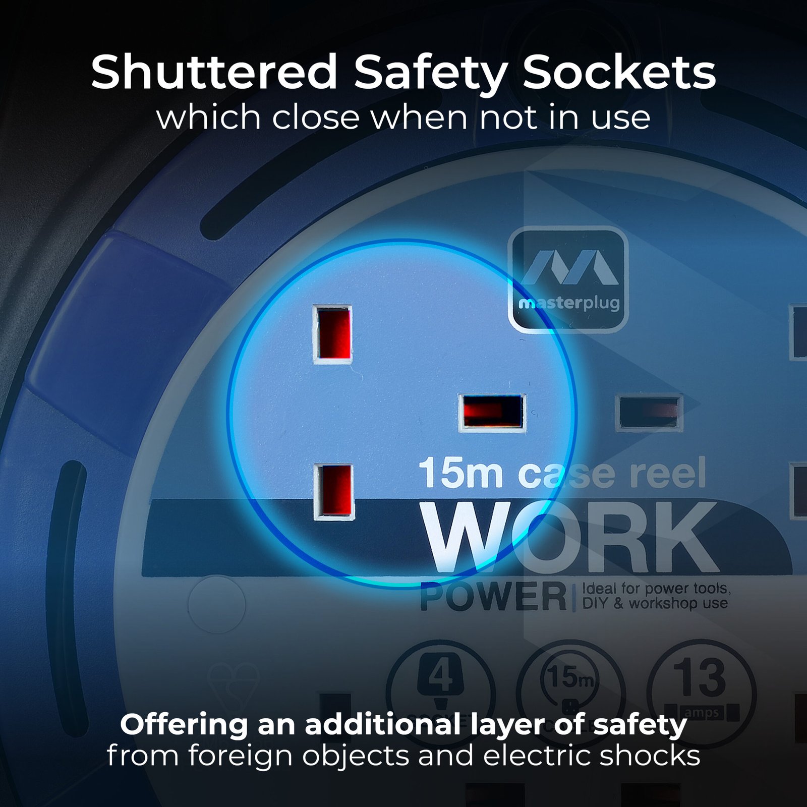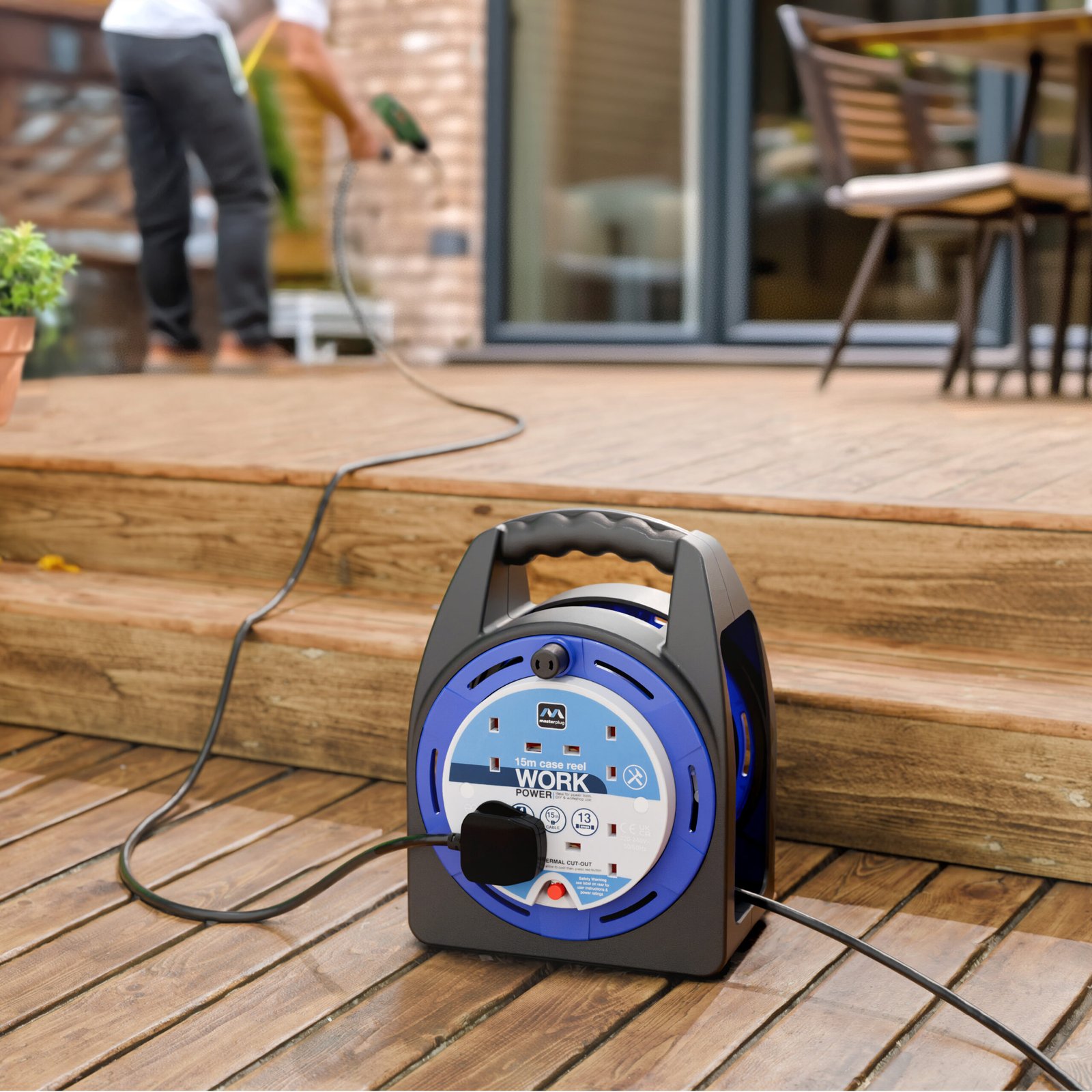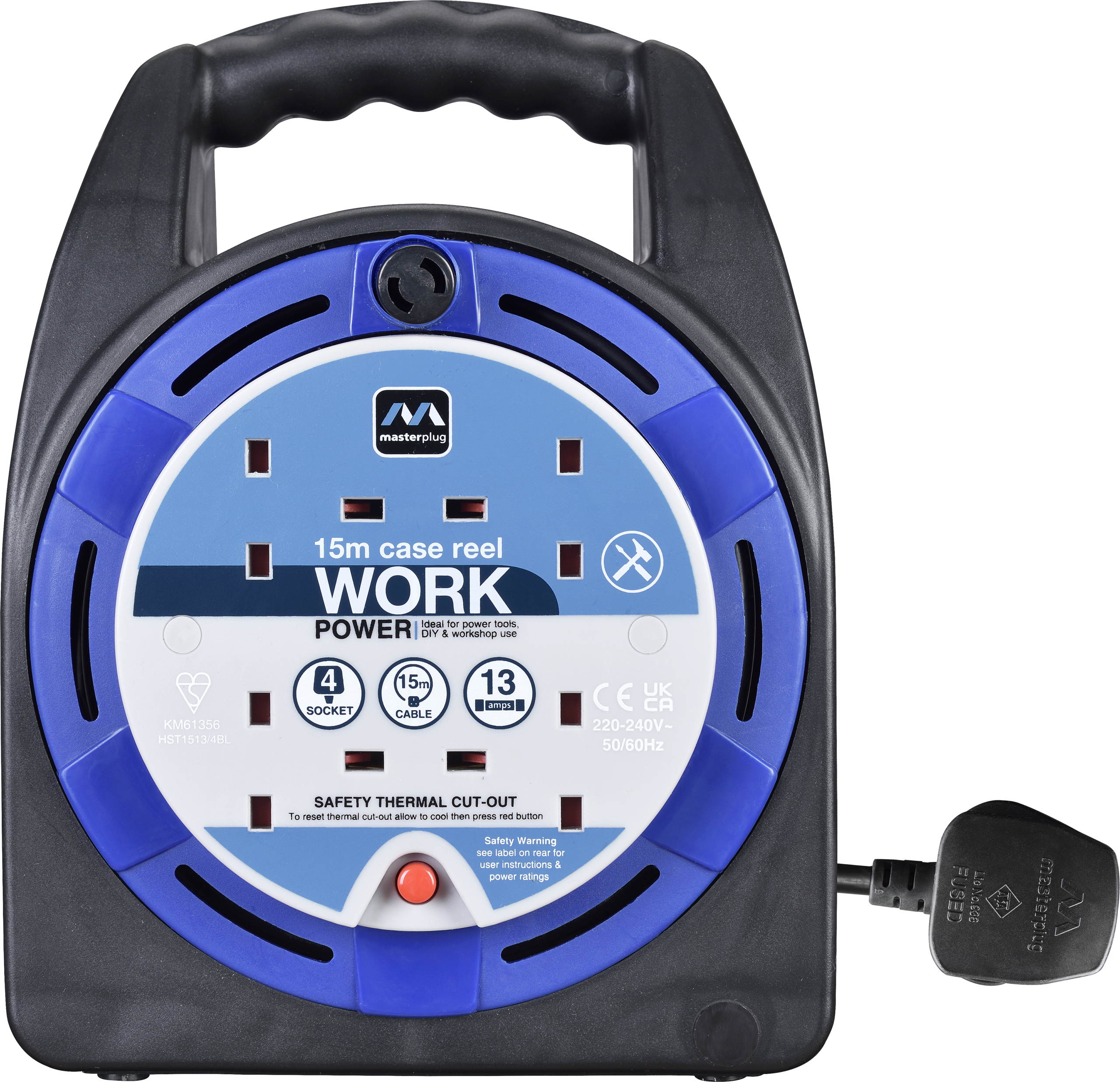 4 Socket Case Reel Extension Lead, 13 Amp, 15 Metres, Blue