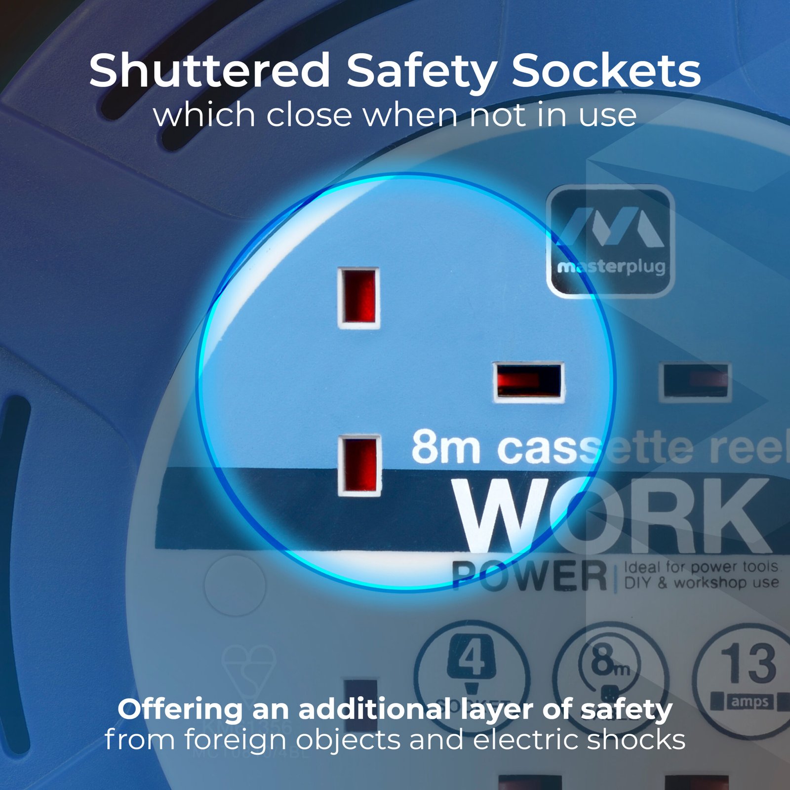 4 Socket Cassette Reel Extension Lead, 13 Amp, 8 Metres, Blue