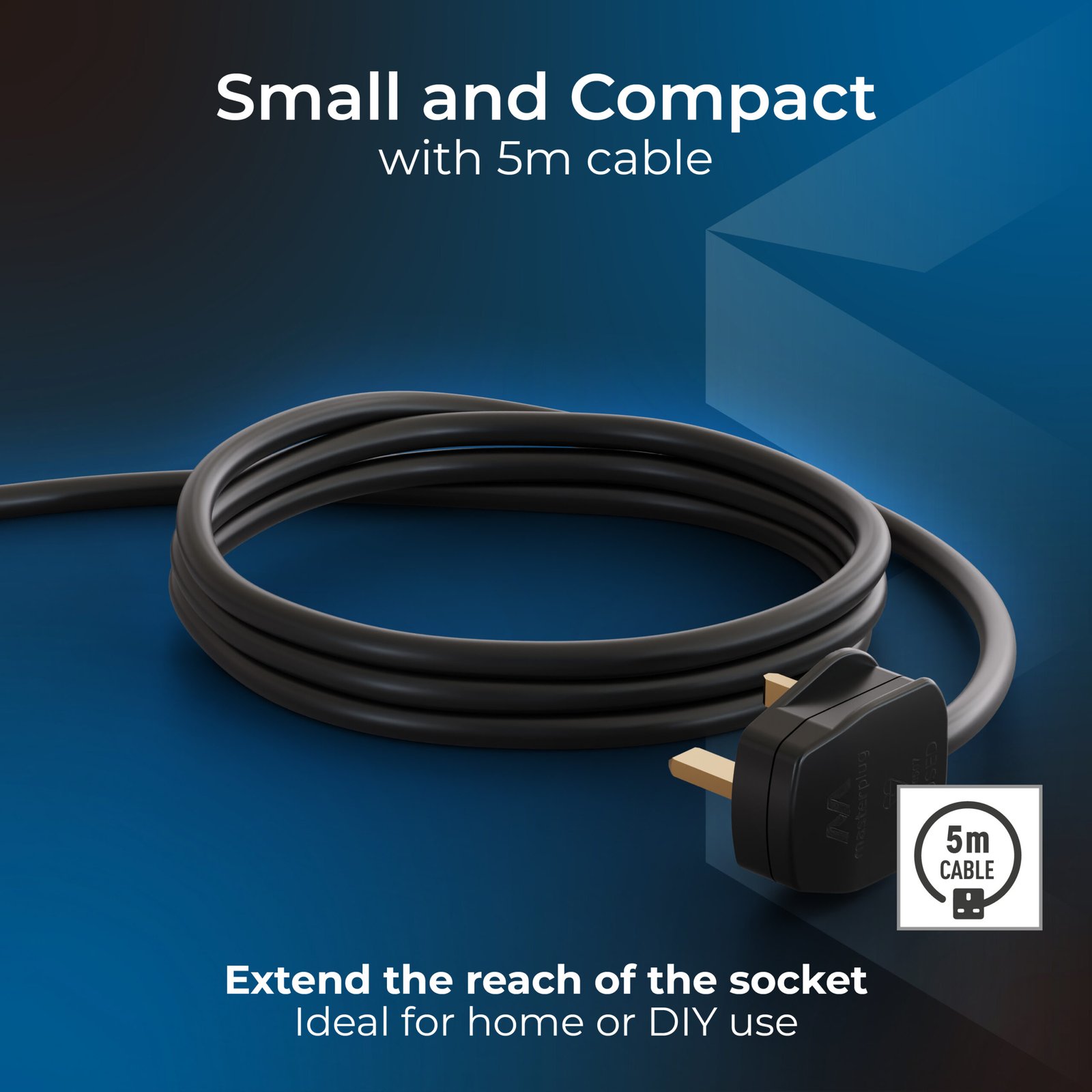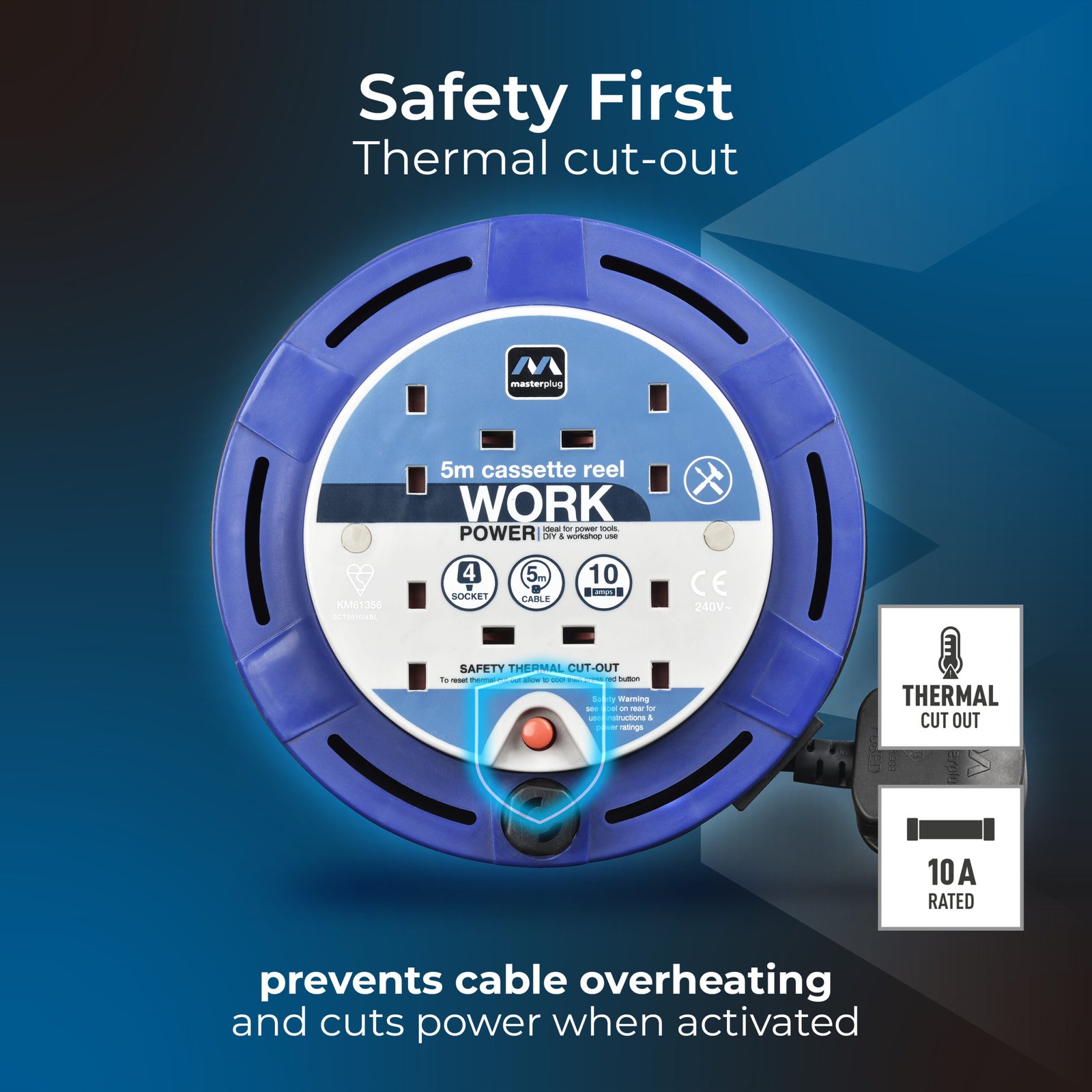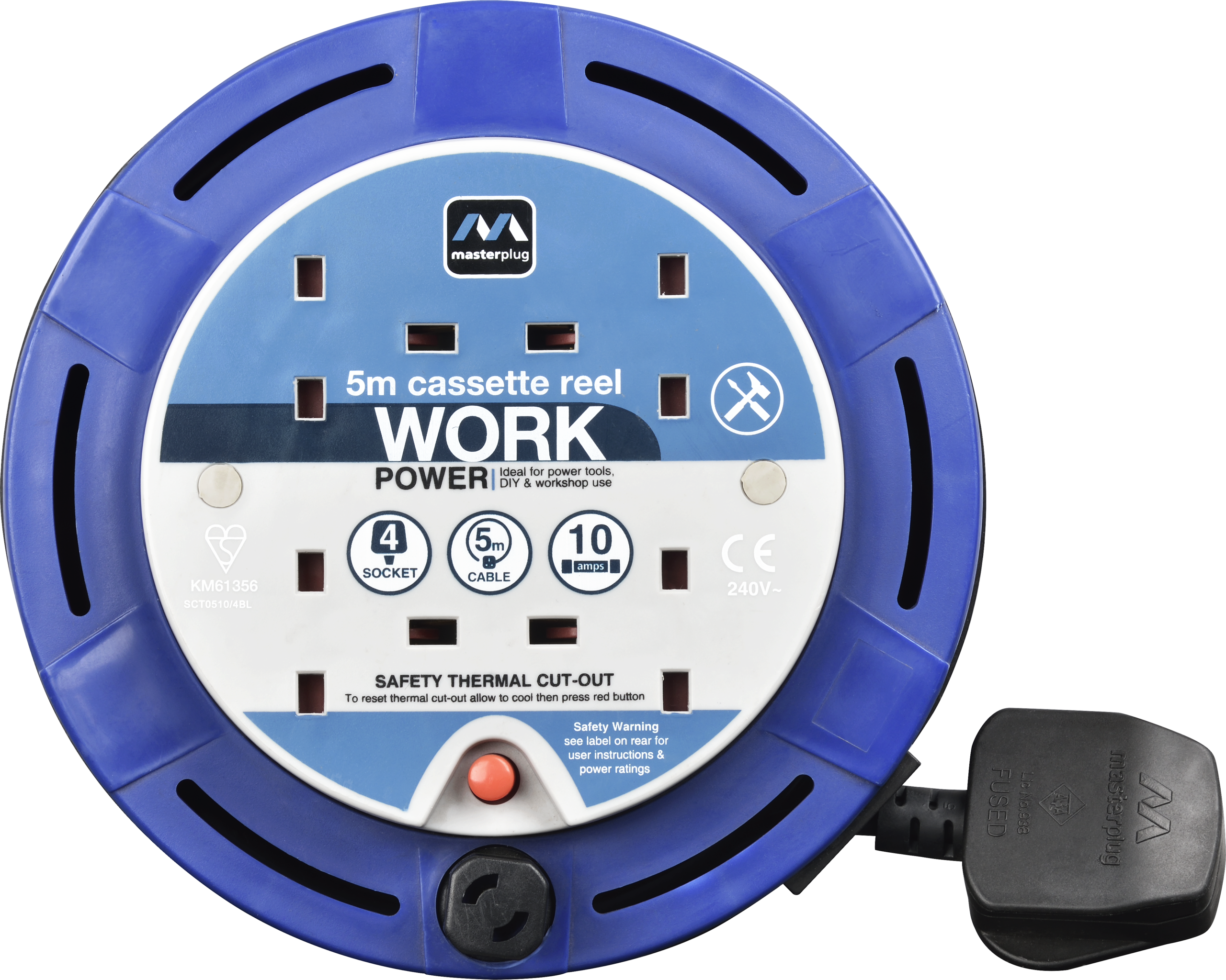 This Masterplug compact cassette reel is just perfect when you need a cable reel around the home. The sturdy yet light portable cable reel has a 5 metre cable with four sockets, enabling you to use for home or even in the garden.