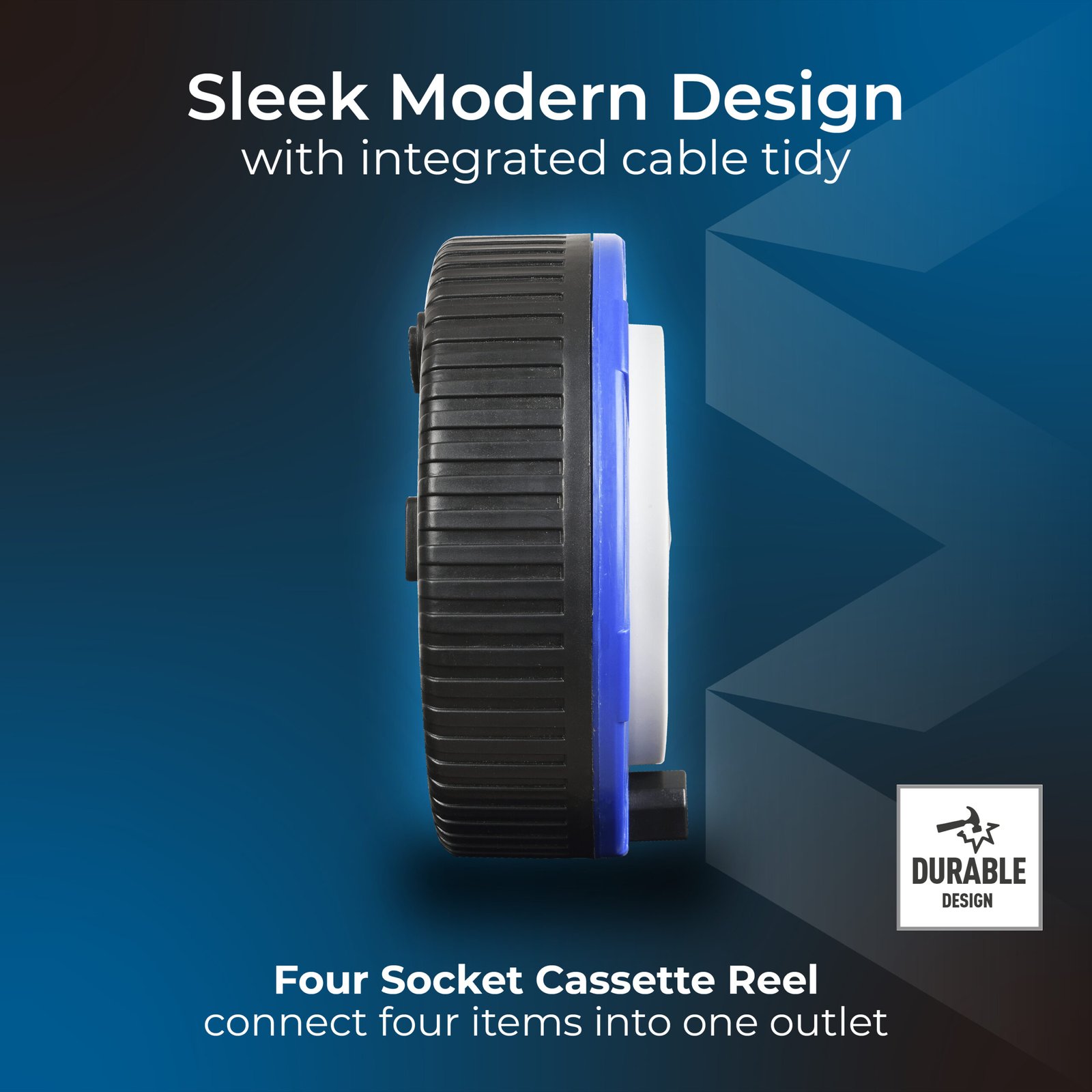4 Socket Cassette Reel Extension Lead, 10 Amp, 5 Metres, Blue